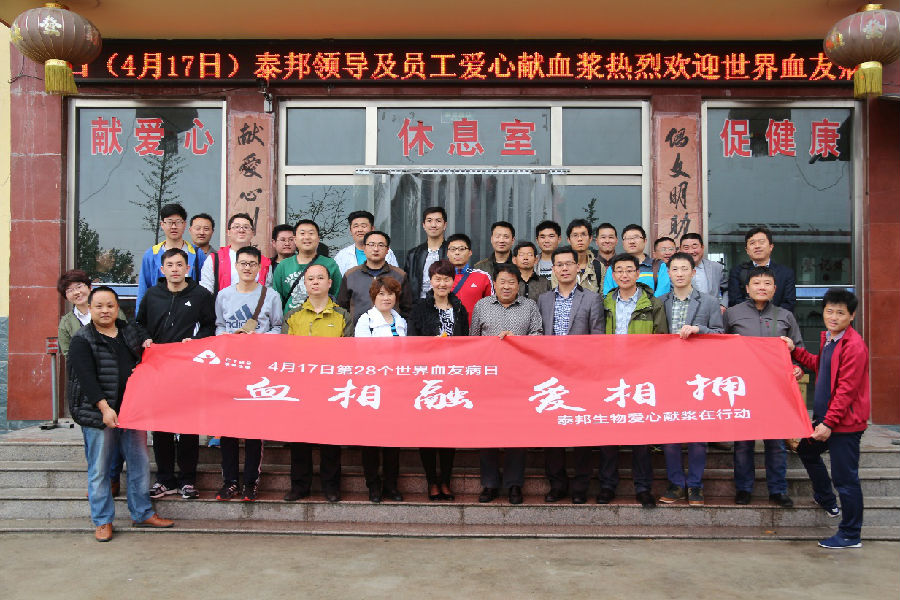 2016年4月16-17日,為迎接“第28個(gè)世界血友病日”的到來(lái),山東泰邦生物制品有限公司組織員工五十余人到寧陽(yáng)漿站舉行了捐獻血漿公益活動(dòng)?;顒?dòng)以“血相融· 愛(ài)相擁”為主題,旨在以泰邦人的實(shí)際行動(dòng)號召更多的愛(ài)心人士加入到獻漿隊伍,提高公眾對于血友?。δ苷系K遺傳性疾?。┑年P(guān)注度,喚起全社會(huì )對于血友病患者的關(guān)愛(ài)和支持。